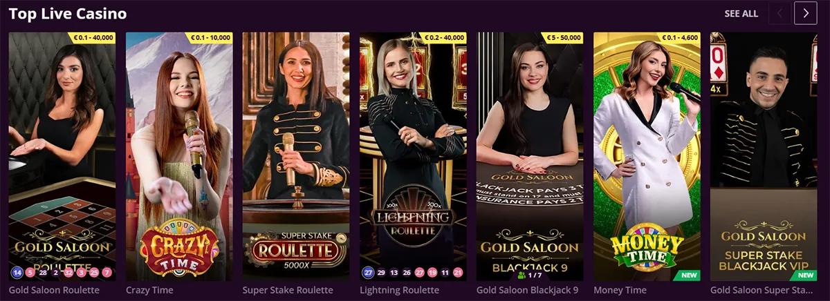 Our live casino operates with Evolution Gaming dealers providing real-time gameplay across multiple table games. Live dealer games include blackjack, roulette, baccarat, and poker variants with professional croupiers.