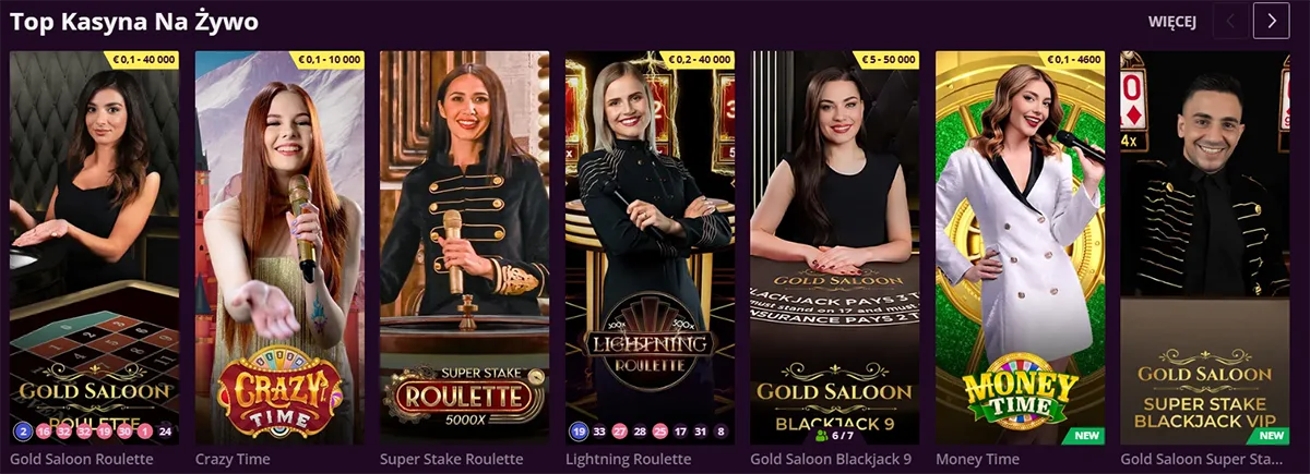 Kasyno na żywo stanowi prawdziwy klejnot naszej oferty. Live dealerzy prowadzą gry w czasie rzeczywistym z profesjonalnych studiów. Gry na żywo obejmują ruletkę, blackjack, bakarat oraz poker.